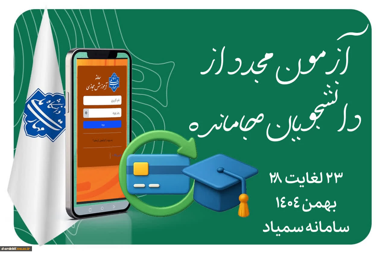 آزمون مجدد از ۲۳ لغایت ۲۸ بهمن ماه ۱۴۰۴ به صورت مجازی و صرفاً در سامانه سمیاد برگزار خواهد شد.